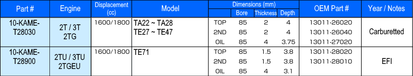 - Kameari standard piston ring sets for Toyota 2T & 3T engines