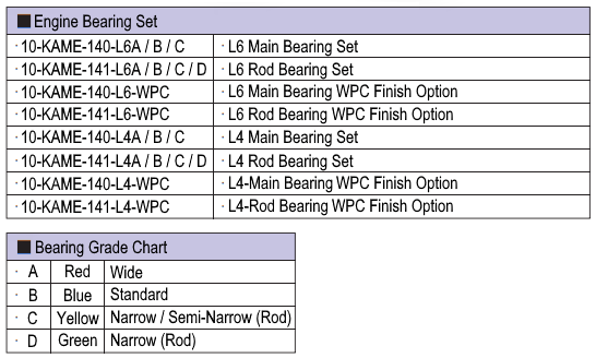 | 10-KAME-141-L6-WPC | L6 Rod Bearing WPC Finish Option | 80 |