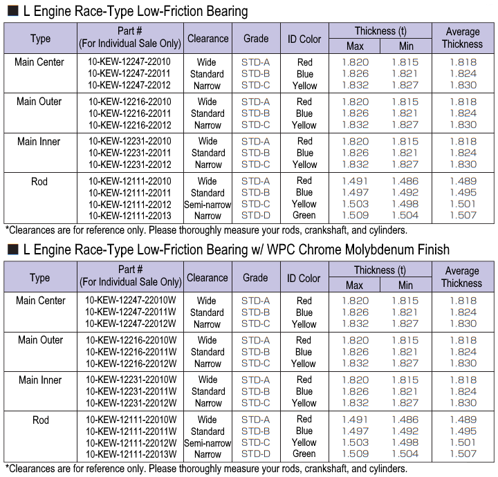 - Engine bearing sets for Nissan L engines